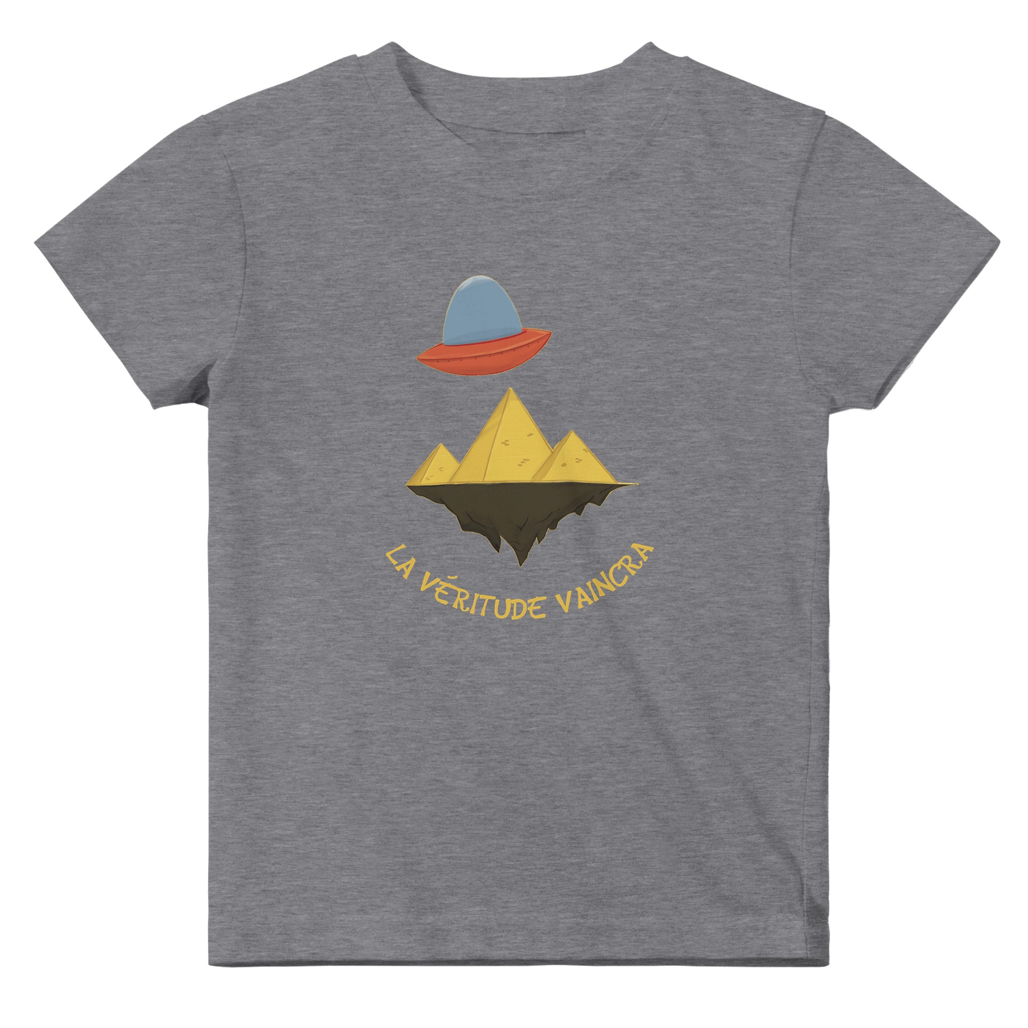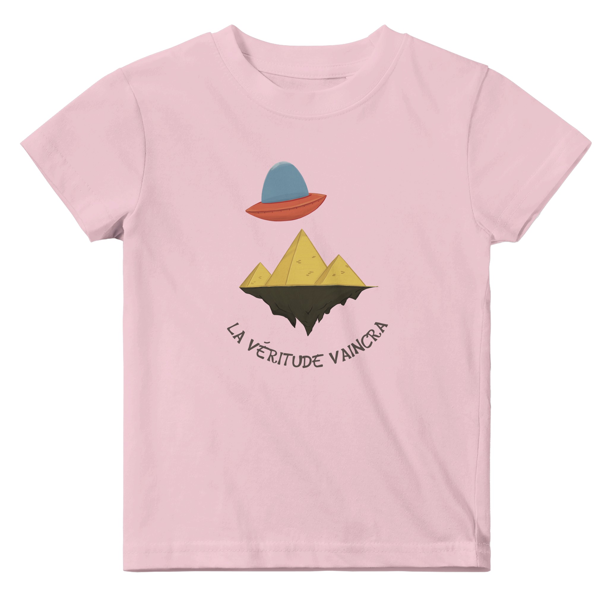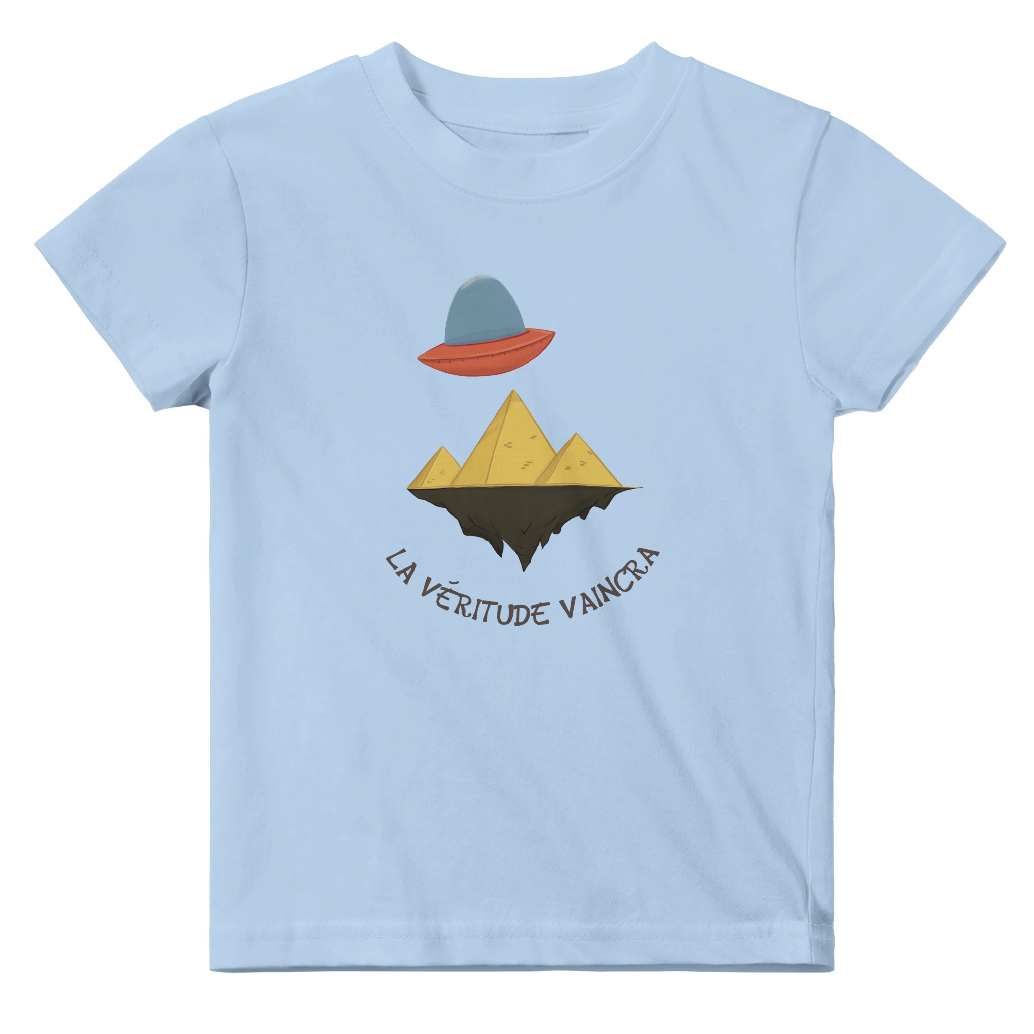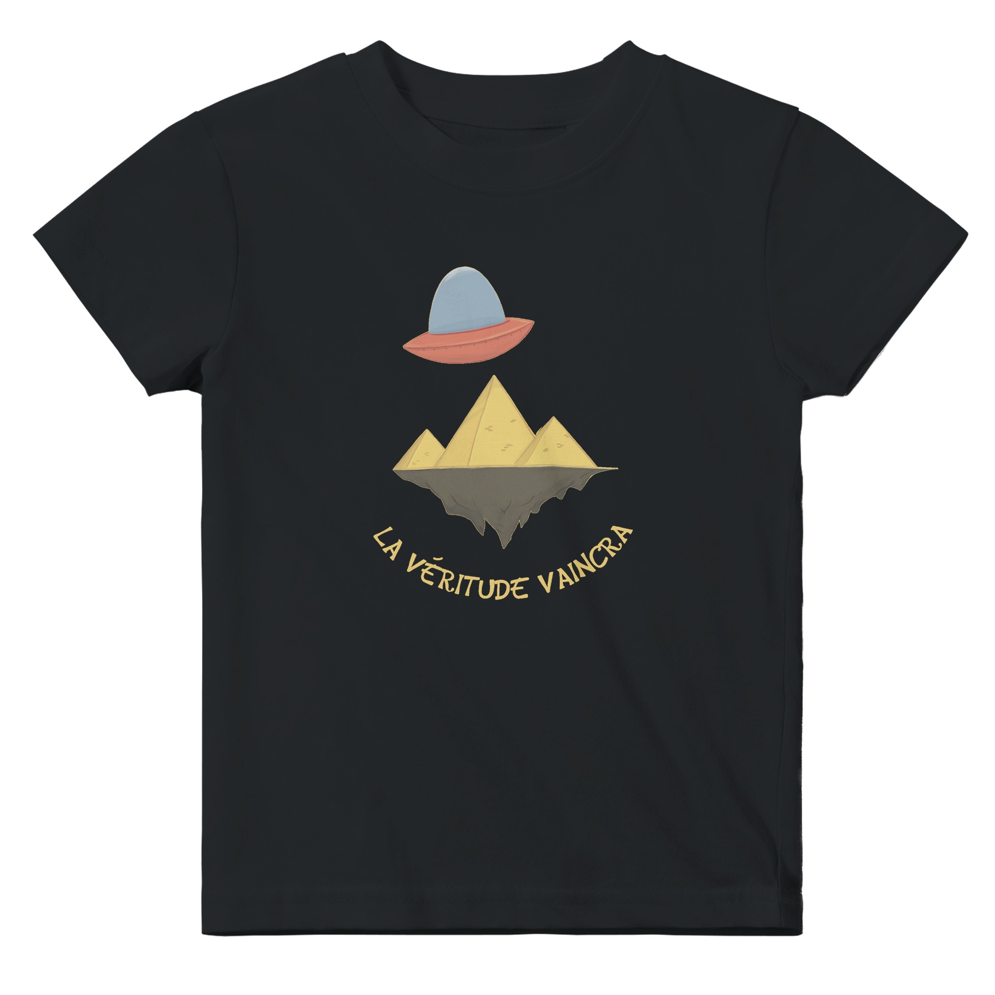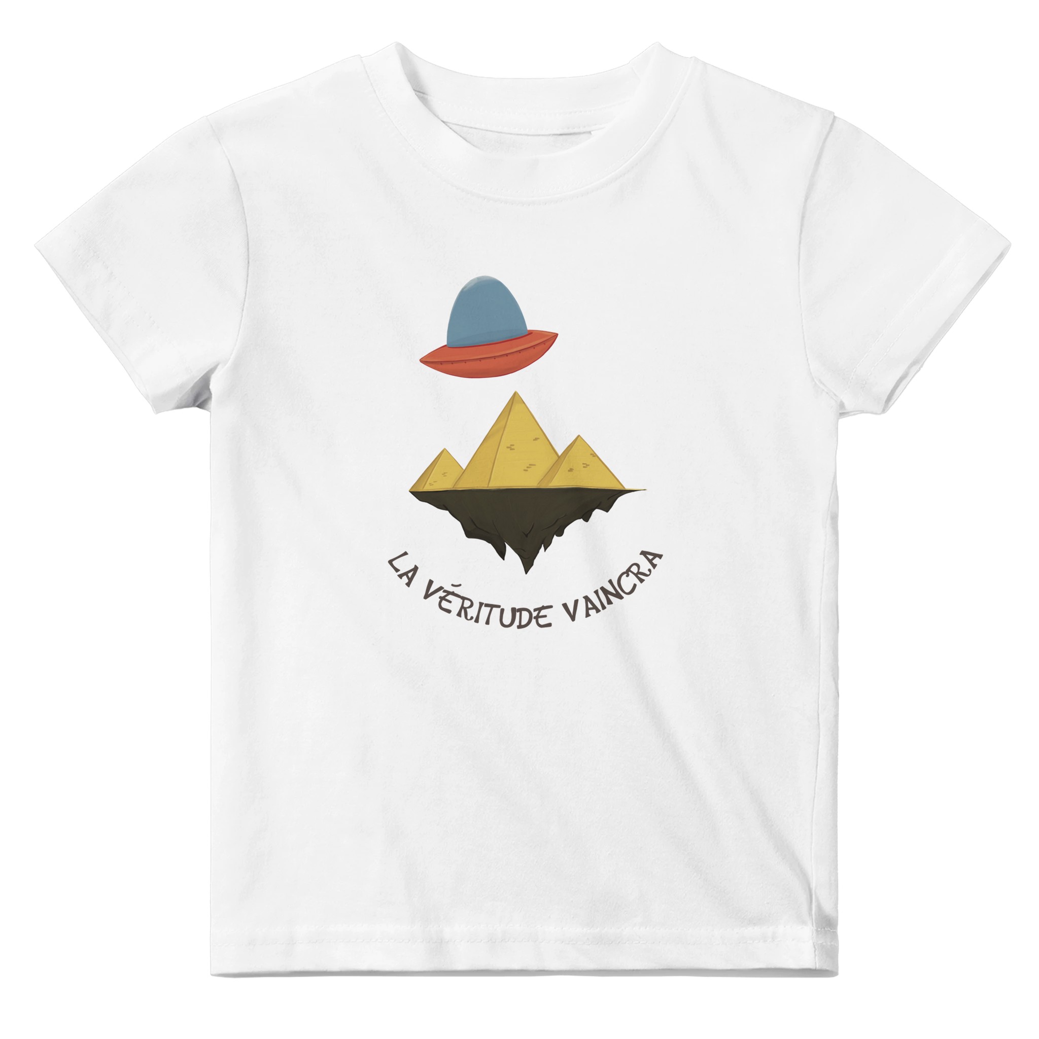 Son design unique et humoristique met en scène un OVNI survolant des pyramides posées sur une terre plate, une référence légère et décalée aux théories du complot populaires. Avec la phrase « La véritude vaincra ! », ce t-shirt se moque avec malice des idées farfelues, tout en ajoutant une touche d’humour à la garde-robe de ton petit.