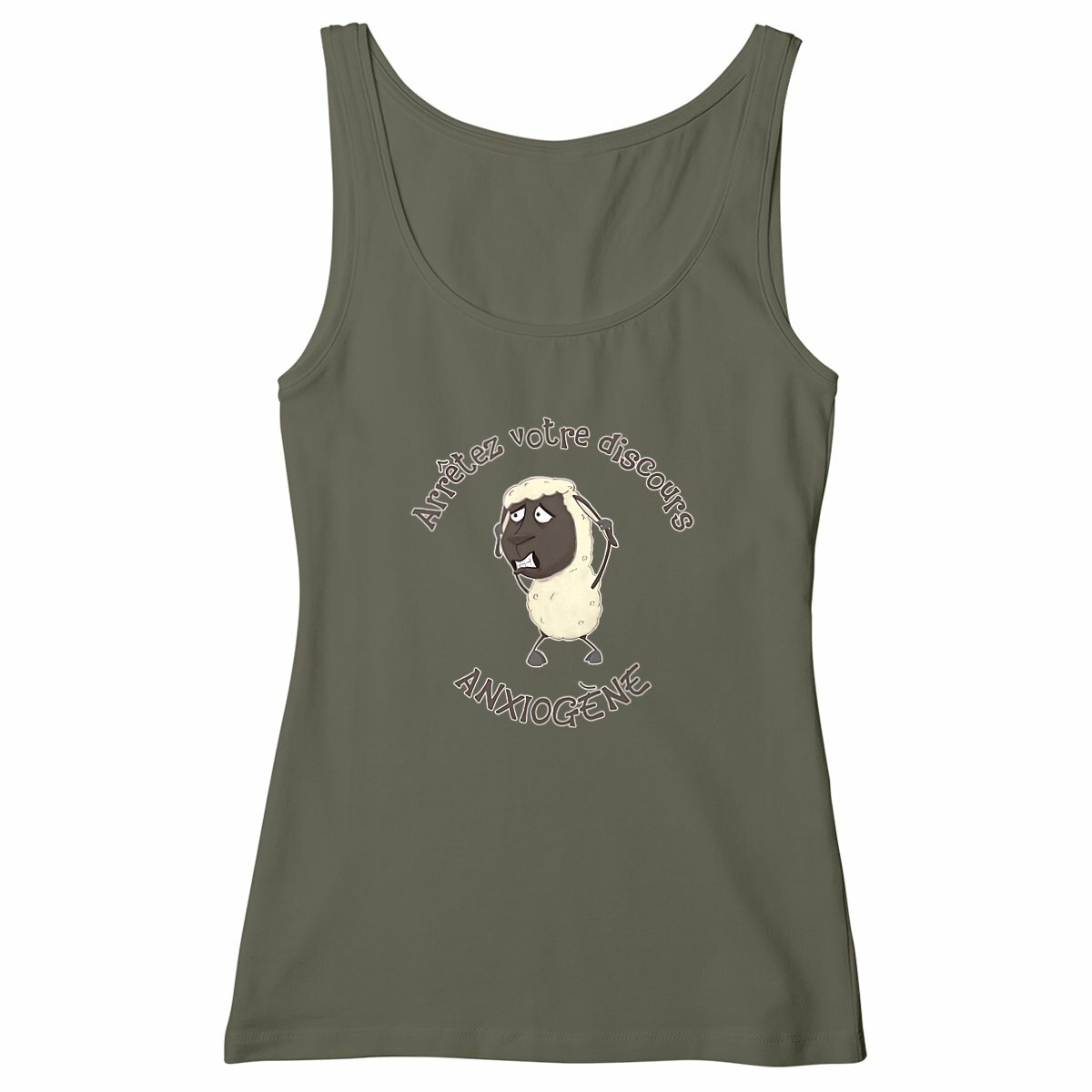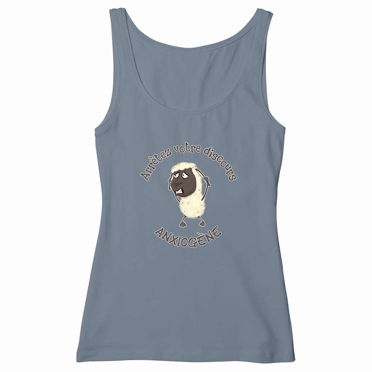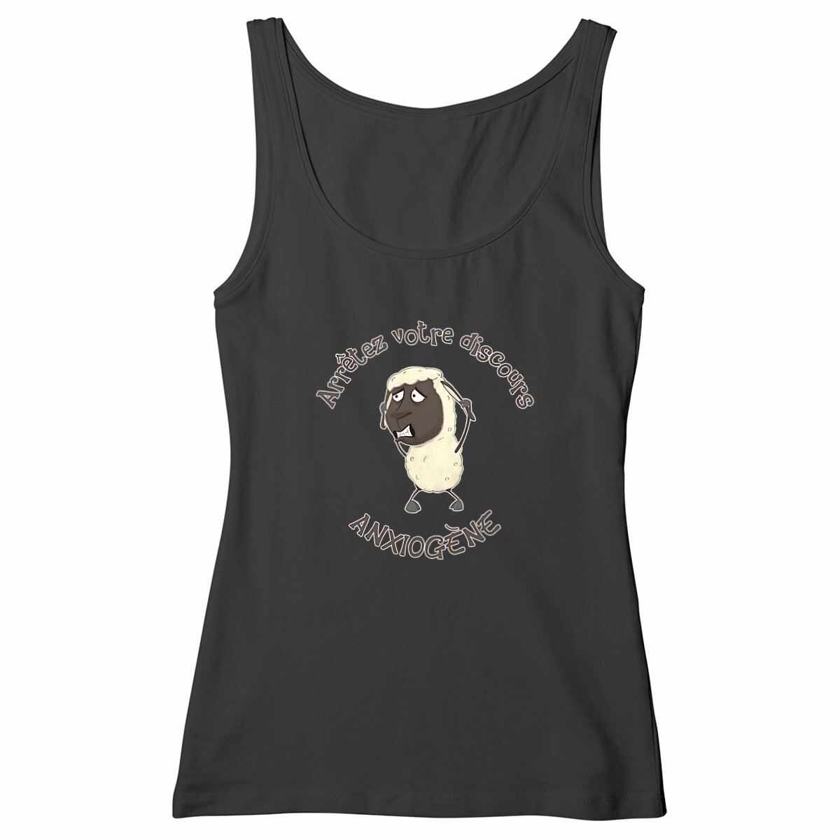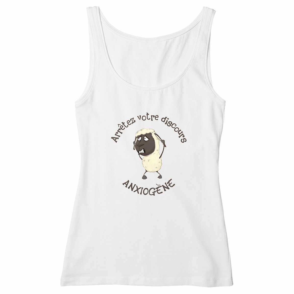 Si tu aimes l’ironie et les vêtements qui font sourire (ou grincer des dents), ce débardeur femme est fait pour toi ! Il porte l’inscription « Arrêtez votre discours anxiogène ! », un cri du coeur provenant d’un petit mouton au bord de la crise de nerfs : le symbole de ceux qui préfèrent nier la réalité, en accusant le gouverne-Ment de semer la panique pour mieux contrôler la population, plutôt que de l’affronter. Un clin d’œil piquant à l’absurdité de certains discours complotistes !