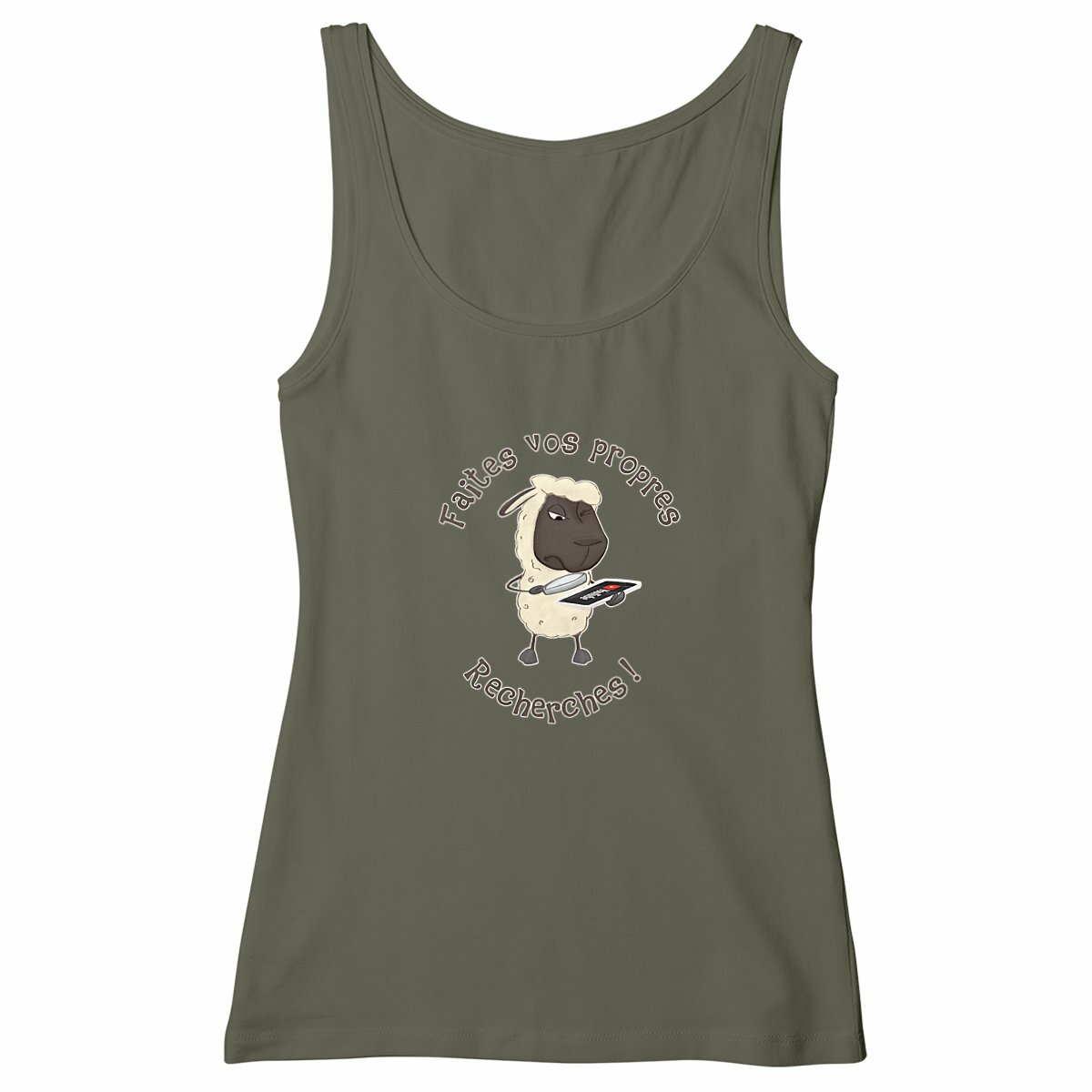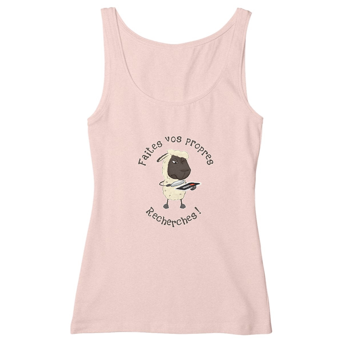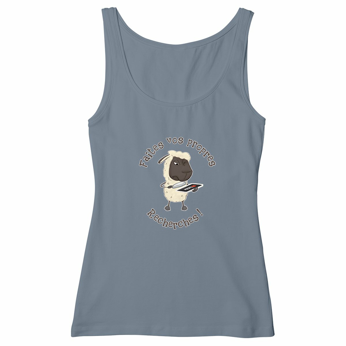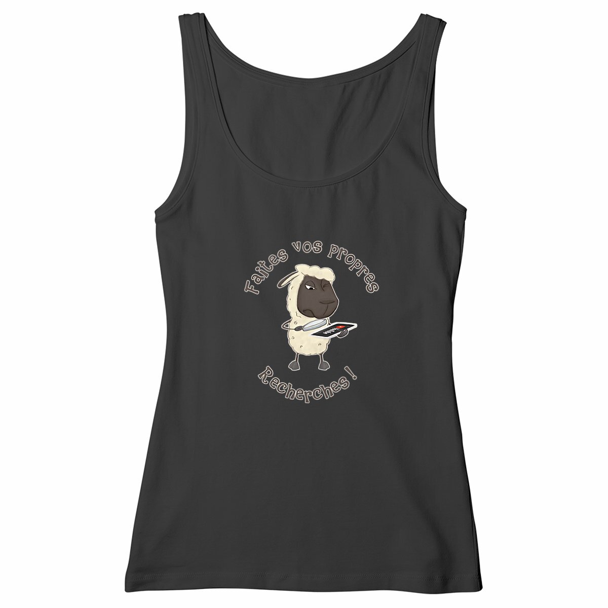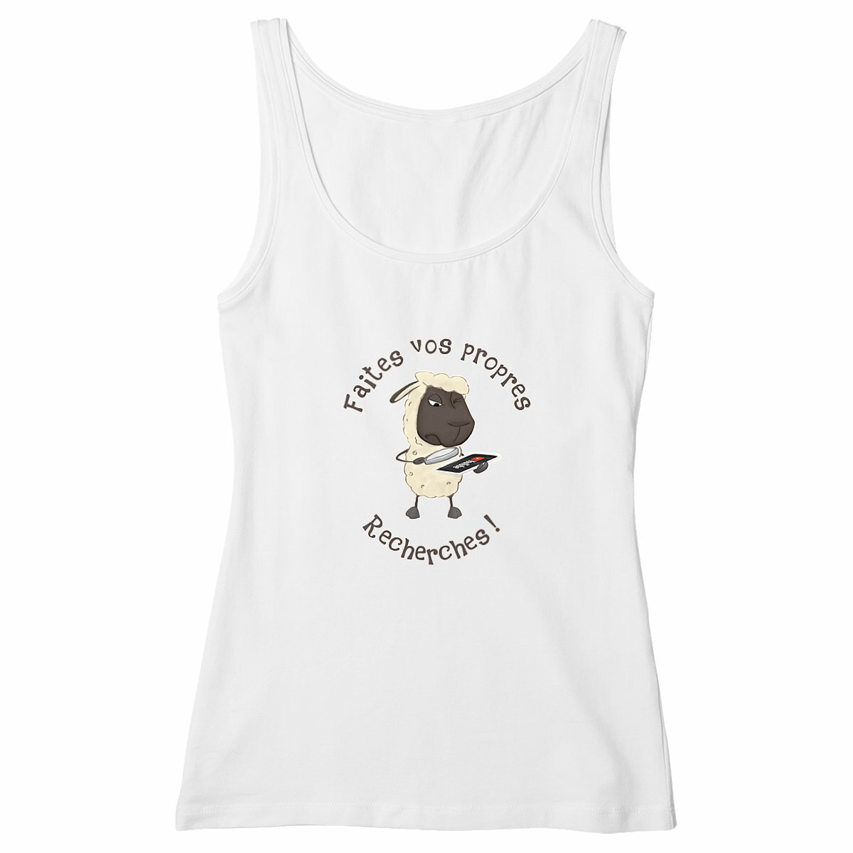 Tu as le sens de l’humour et un goût pour l’ironie ? Ce débardeur femme aussi unique que caustique est fait pour toi ! Son illustration montre un mouton absorbé par YouTube, scrutant SA vérité avec sérieux. Spéciale dédicace à tous ceux qui rejettent les médias traditionnels mais gobent sans broncher les vidéos douteuses qui traînent dans les recoins les plus sinistres de la toile… et qui sont peut-être même tournées dans le sous-sol de môman.