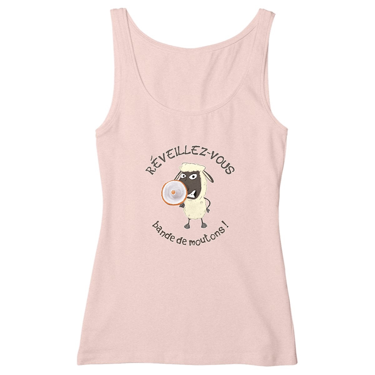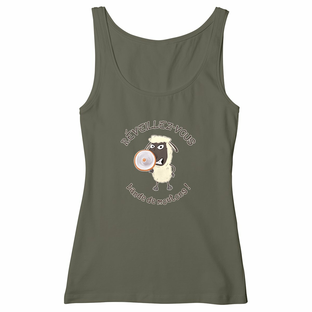 Envie d’un débardeur léger, confortable et plein de second degré ? Ce débardeur femme est la touche d’originalité qui manque à ta garde-robe ! Avec son illustration satirique d’un mouton en colère hurlant dans un mégaphone « Réveillez-vous, bande de moutons ! », ce débardeur se moque avec mordant de ceux qui pensent être les seuls à avoir tout compris… et qui voient des moutons partout, sauf dans leur propre miroir.