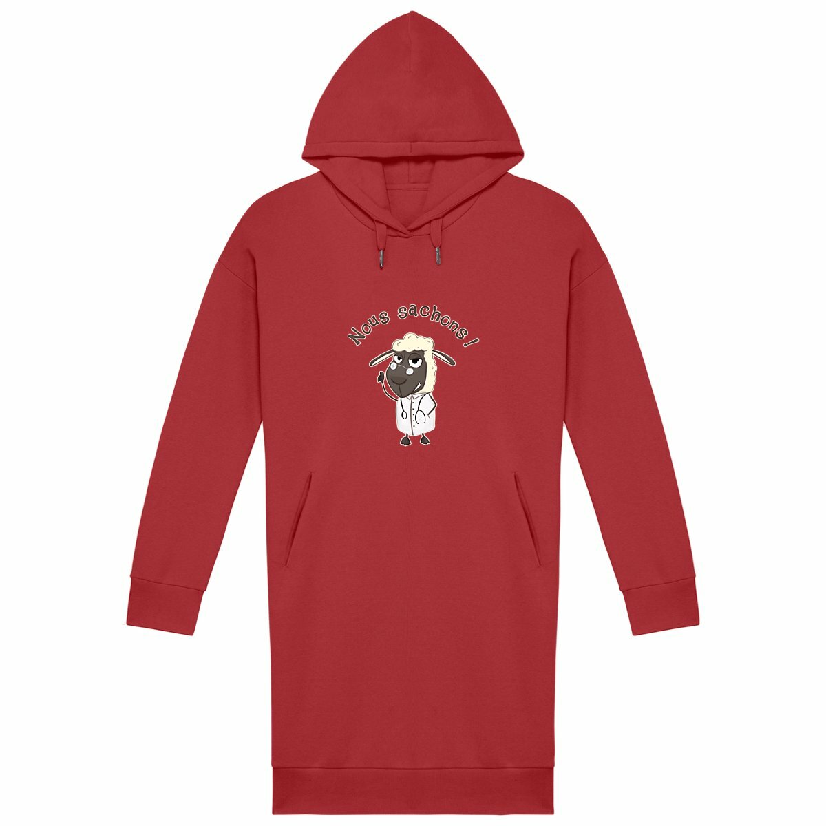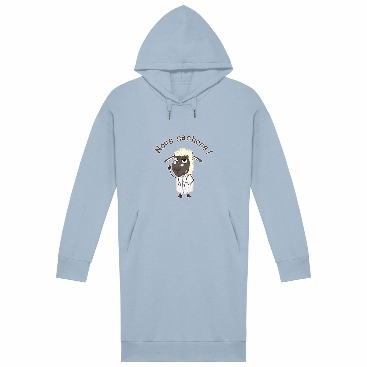 Mais ce qui en fait un vêtement unique et humoristique, c’est bien son dessin de mouton scientifique clamant haut et fort « Nous sachons ! »