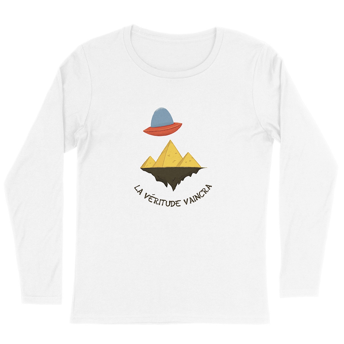 Avec son illustration décalée, tu affiches haut et fort ton second degré. Un OVNI qui survole des pyramides posées sur une Terre plate ? Oui, c’est absurde… et c’est justement pour ça que tu l’adores. Une façon stylée et pleine d’humour de pointer du doigt les théories du complot les plus farfelues.