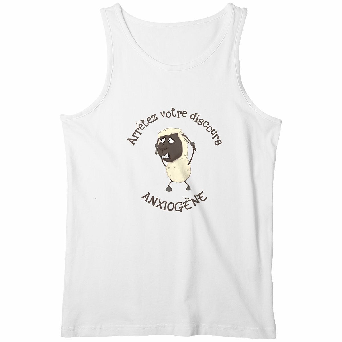 Tu apprécies l’humour sarcastique et les clins d’œil bien sentis ? Ce débardeur est fait pour toi ! Avec son illustration d’un mouton angoissé lançant « Arrêtez votre discours anxiogène ! », il tourne en dérision ceux qui rejettent la réalité dès qu’elle les met mal à l’aise. Un parfait mélange d’ironie et de style pour ceux qui aiment rire des contradictions.