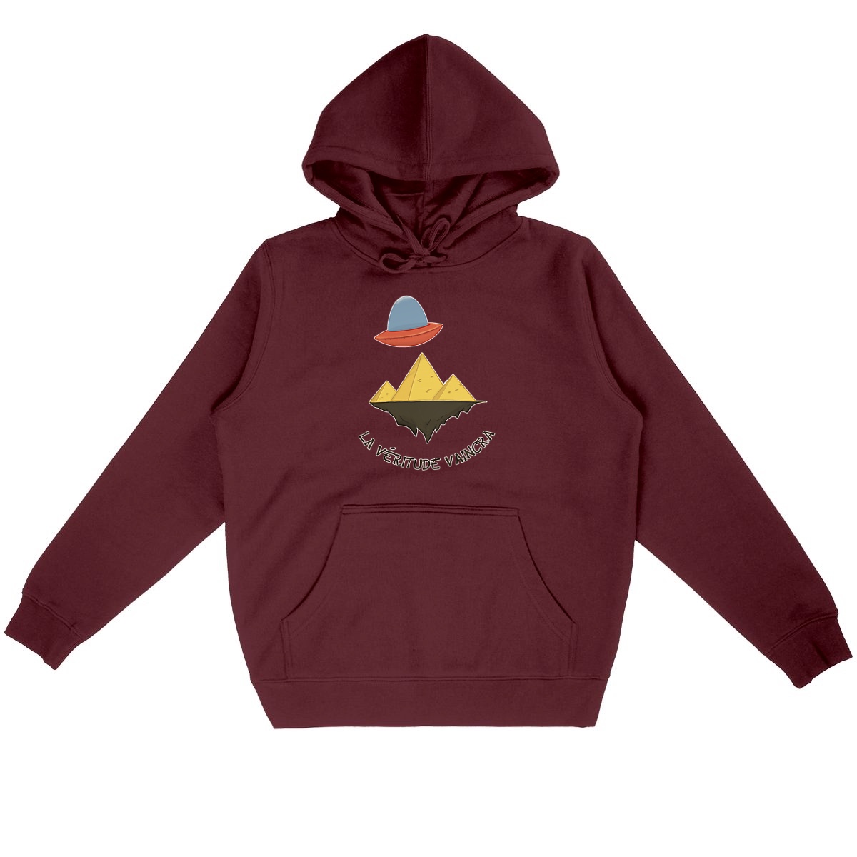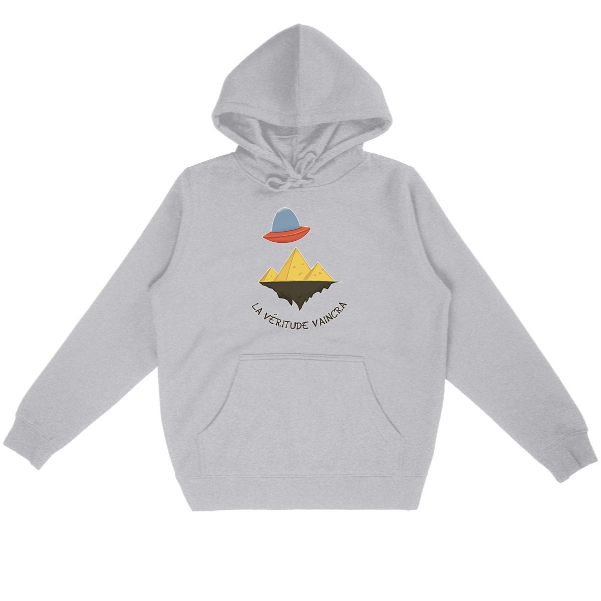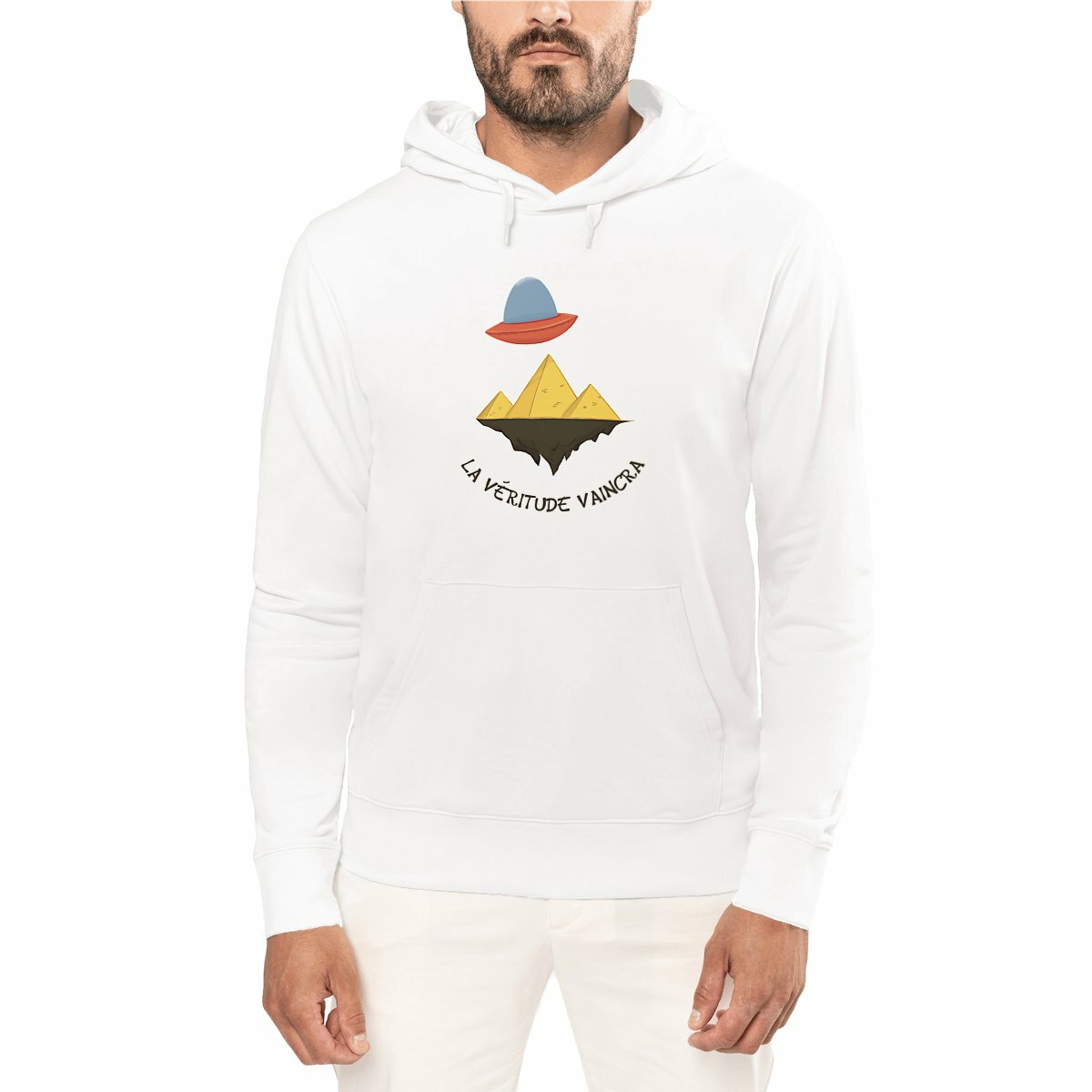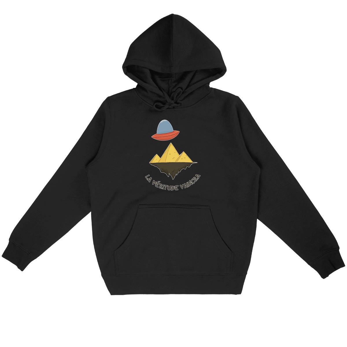 Tu es du genre à prendre du recul et à rire des théories du complot les plus absurdes ? Ce sweat à capuche est fait pour toi ! Son illustration décalée met en scène une soucoupe survolant des pyramides… posées sur une terre plate. Un clin d’œil humoristique à toutes ces histoires incroyables sur les extraterrestres, l’État profond, le nouvel ordre mondial ou encore les francs-maçons. Parce qu’au final, un peu d’ironie ne fait jamais de mal !