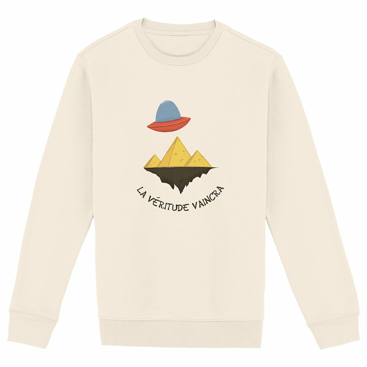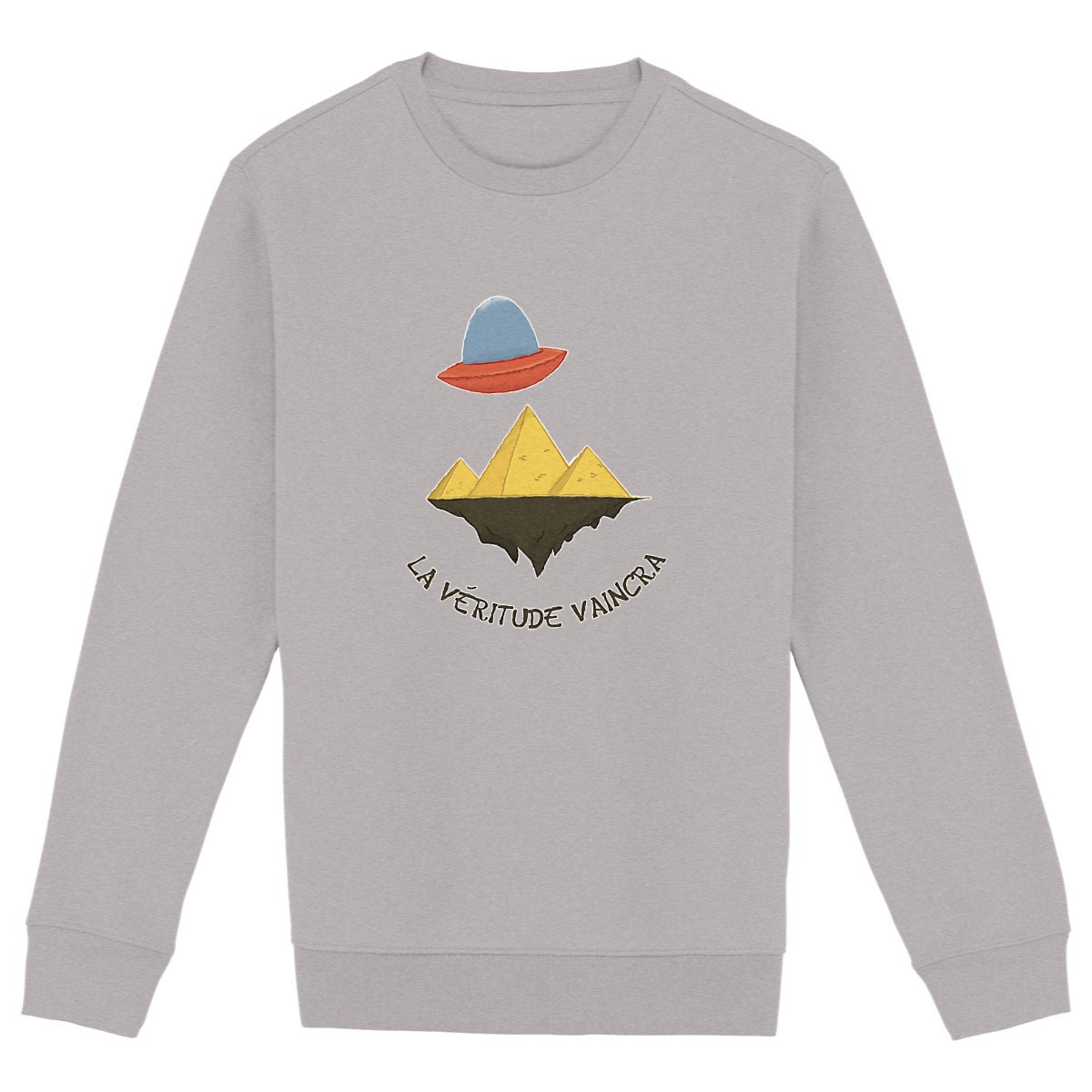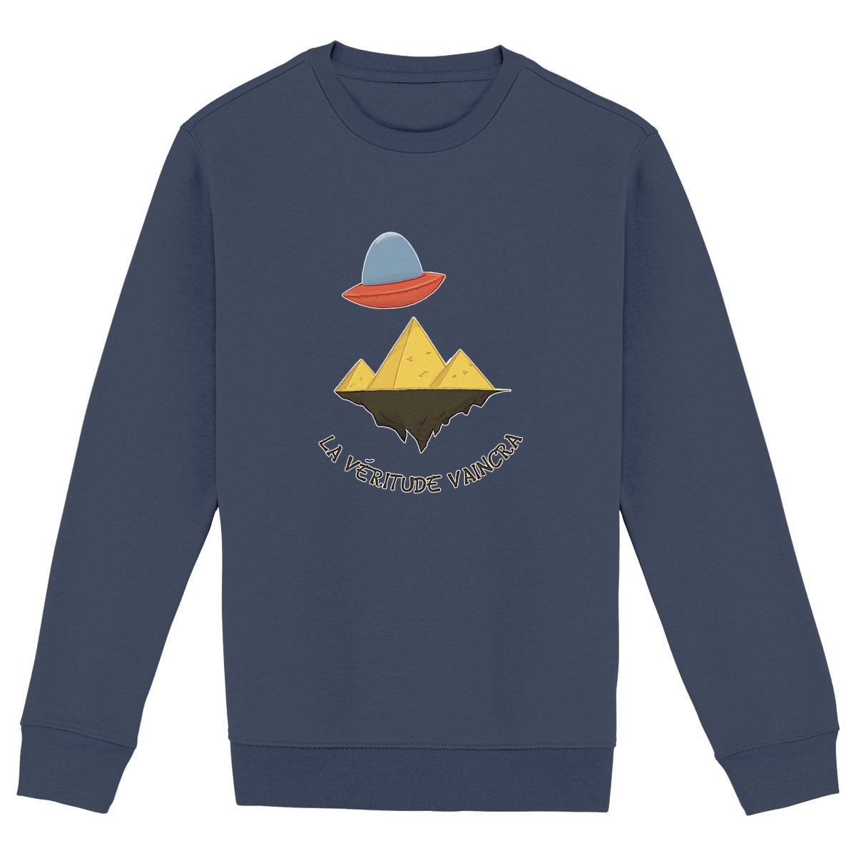 Un sweat BIO décalé et humoristique pour ceux qui aiment rire des théories du complot les plus farfelues. L’illustration présente un ovni survolant des pyramides posées sur une Terre plate, une façon ironique de tourner en dérision les idées complotistes (extraterrestres, état profond, franc-maçonnerie, terre plate, et bien d’autres). Un design audacieux pour afficher ton sens de l’humour face aux croyances les plus extravagantes !