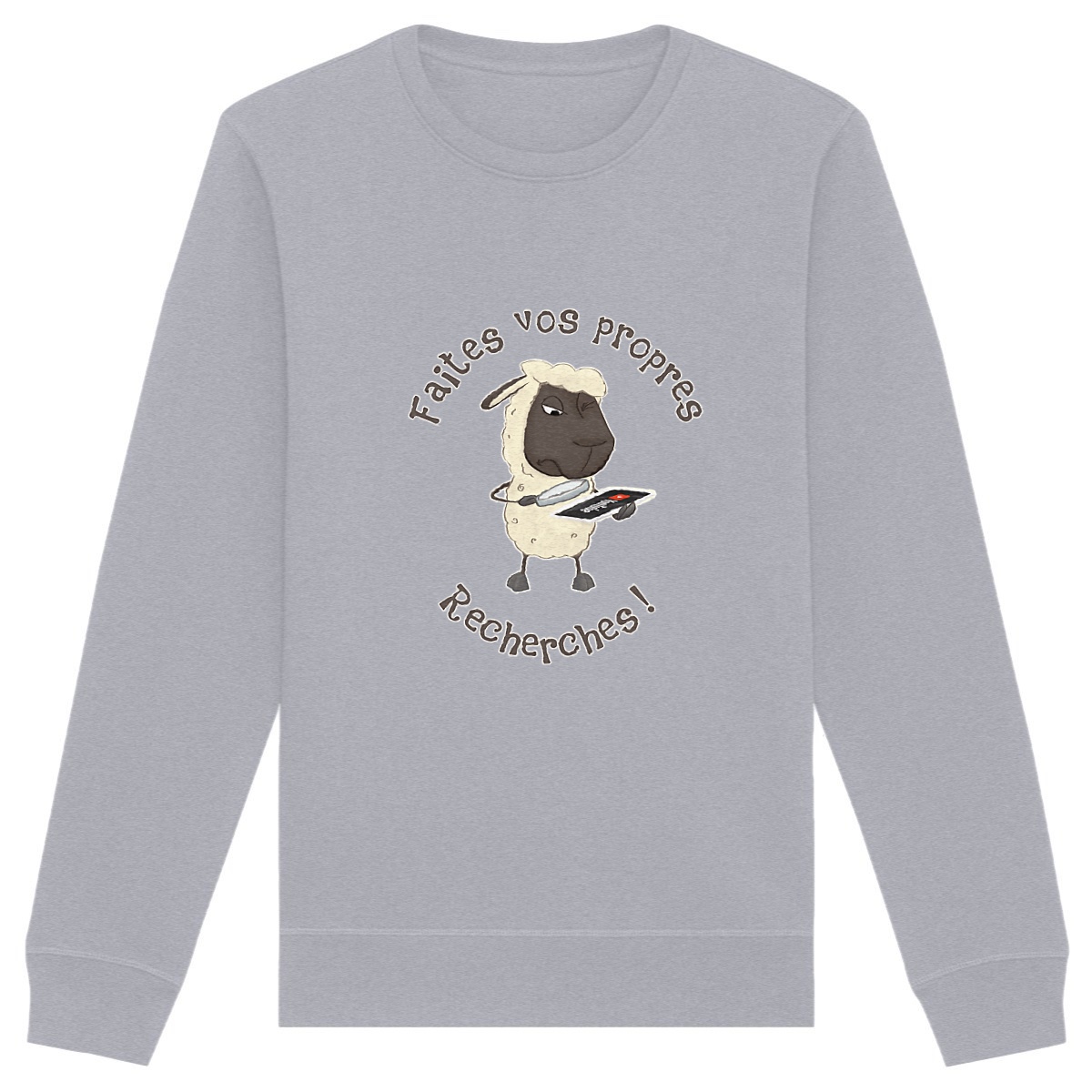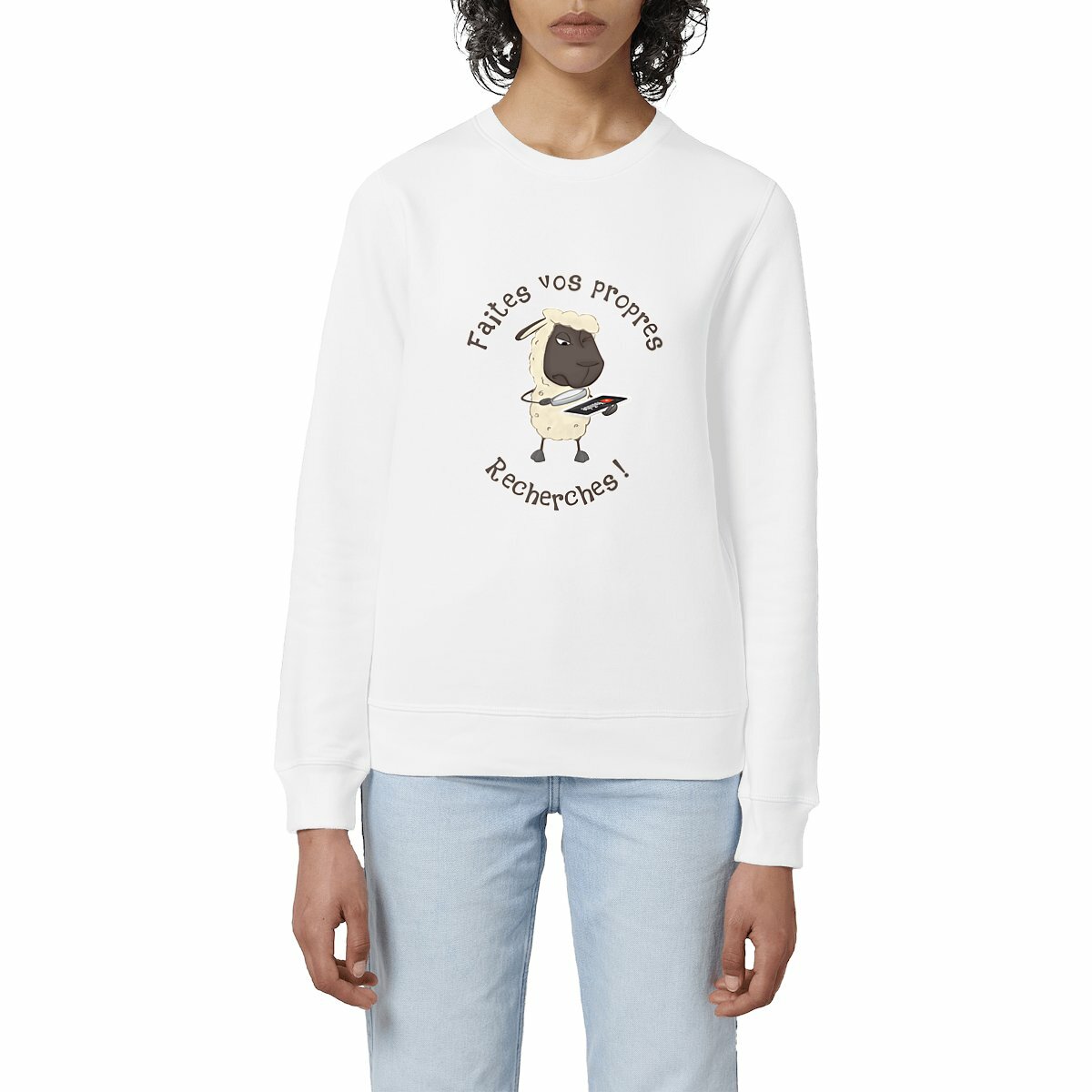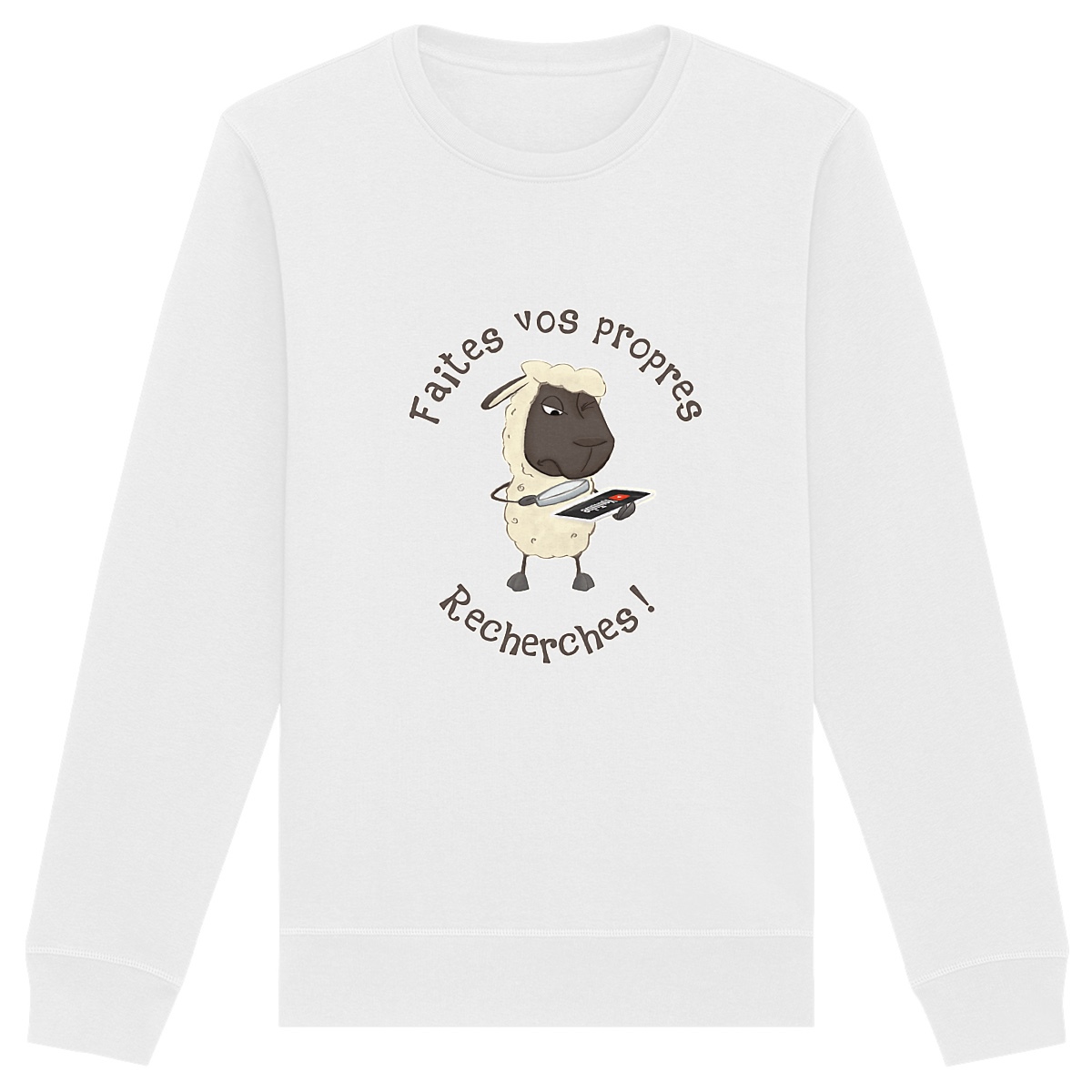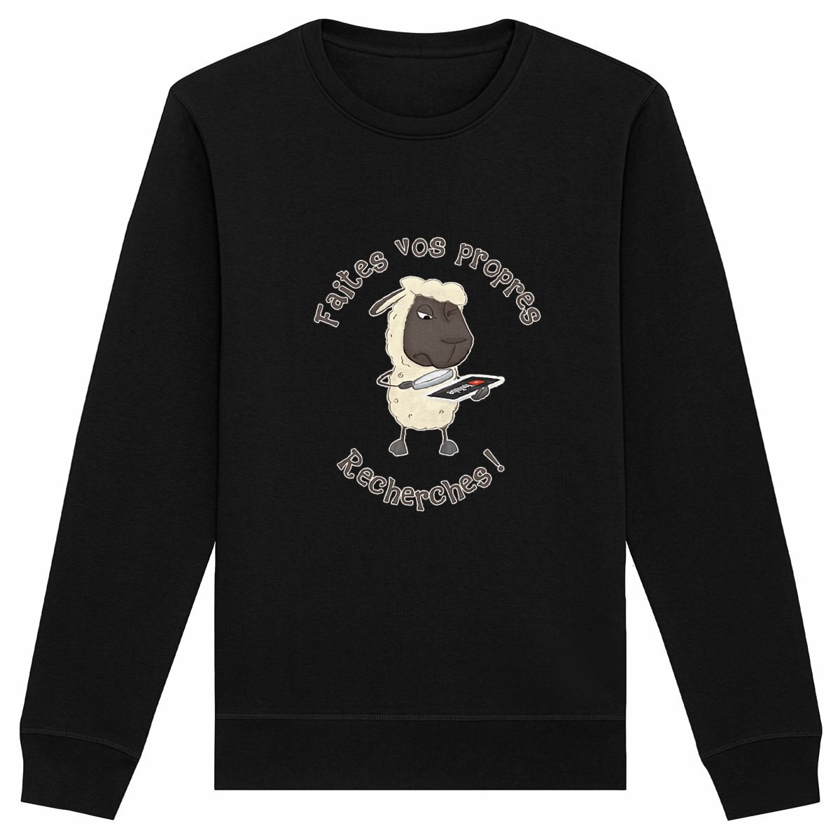 Un sweat à l’humour noir et grinçant, parfait pour ceux qui aiment moquer les amateurs de pseudo-science ! L’illustration représente un mouton scrutant YouTube avec concentration, accompagné de la célèbre phrase « Faites vos propres recherches ! », un clin d’œil ironique à ceux qui préfèrent les vidéos douteuses aux sources d’informations vérifiées.