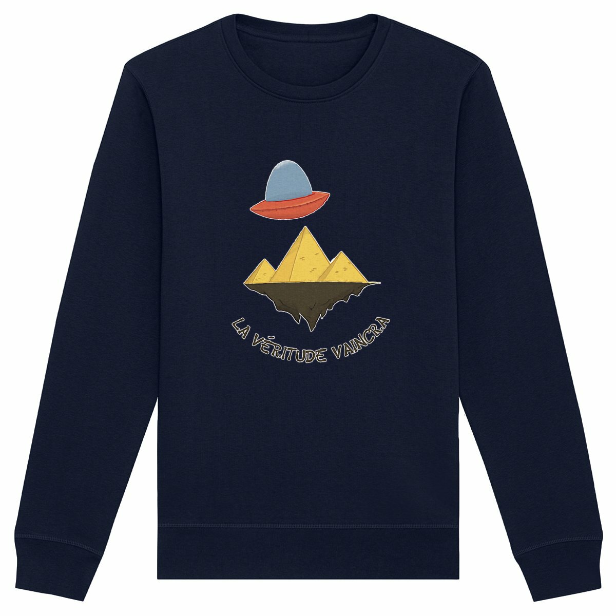 Montre ton sens de l’humour avec ce sweat-shirt unisexe au design original et satirique ! Son illustration décalée représente un OVNI survolant des pyramides posées sur une Terre plate, un clin d’œil amusé aux théories du complot les plus farfelues. Un must-have pour ceux qui aiment rire des idées extravagantes sur les extraterrestres, l’état profond ou encore la franc-maçonnerie !
